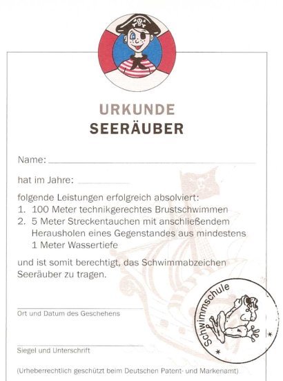 Der Kurs richtet sich an Kinder die bereits Ihr Seepferdchen Abzeichen gemacht haben und darauf aufbauen möchten. Das nächste Abzeichen vor dem Bronze Abzeichen heißt Seeräuber. Wir üben intensiv für den Seeräuber und erlernen weitere Schwimmstile wenn es die Zeit zulässt, Tieftauchen, Streckentauschen usw. |